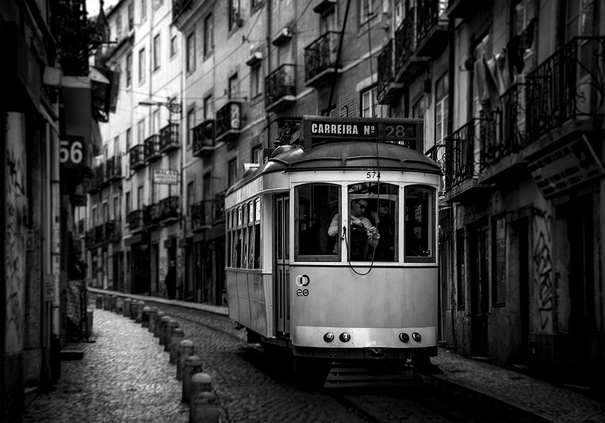 Carreira nº 28 fanger Lisboa i bevegelse: den ikoniske gule trikken slynger seg gjennom Alfamas bratte smug og forbi azulejo-kledde fasader, med glimt av Baixa og Graça. Adolfo Urrutia formidler varme, nostalgi og byens pulserende sjel – en stemningsfull hyllest til Eléctrico 28. Perfekt for alle som elsker europeisk bysjarm og klassisk transport.
