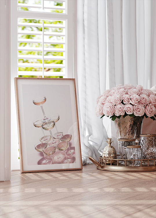 Et elegant tårn av champagneglass skinner i myke pasteller mot ren, hvit bakgrunn. Boblene fanger lyset og danner delikate refleksjoner – en hyllest til fest, feiring og øyeblikk som varer. Minimalistisk og sofistikert, perfekt som blikkfang på kjøkken, barvogn eller i stuen. Gir rommet et løft med lett, luftig energi og hint av glam.
