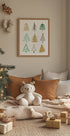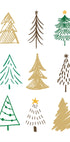En moderne minimalistisk illustrasjon med en samling abstrakte juletredesign i grønt, gull og brunt. Hvert tre har en unik håndtegnet stil, perfekt for juledekor og festlig veggkunst.