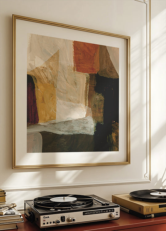 «Cinder» av Dan Hobday er en moderne, abstrakt komposisjon i dempede jordtoner av brun, beige og rustrød. Myke, malte penselstrøk og grafiske former flyter lagvis som røyk og glør, og skaper en rolig, sofistikert stemning. Perfekt som et minimalistisk blikkfang som gir varme og dybde til rommet – både hjemme og på kontoret.