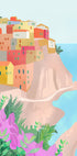 En sjarmerende akvarell-inspirert illustrasjon av Cinque Terre, Italia. Pastellfargede hus på klippene med utsikt over det blå havet, omgitt av frodige planter og blomster. Et perfekt motiv for reiseglade og kystdekor.
