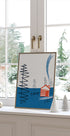 En minimalistisk, moderne illustrasjon av en rød hytte ved et speilblankt vann, omgitt av vinterlige trær og stille fjell. Geometriske linjer, blå–røde toner og røyk fra pipa skaper en rolig, retro stemning. Perfekt for å drømme seg bort til skogen. Motivet er av Nicholas. Nordisk ro, varm peis og et hint av reiselyst gjør motivet tidløst i hjemmet.