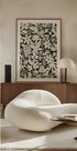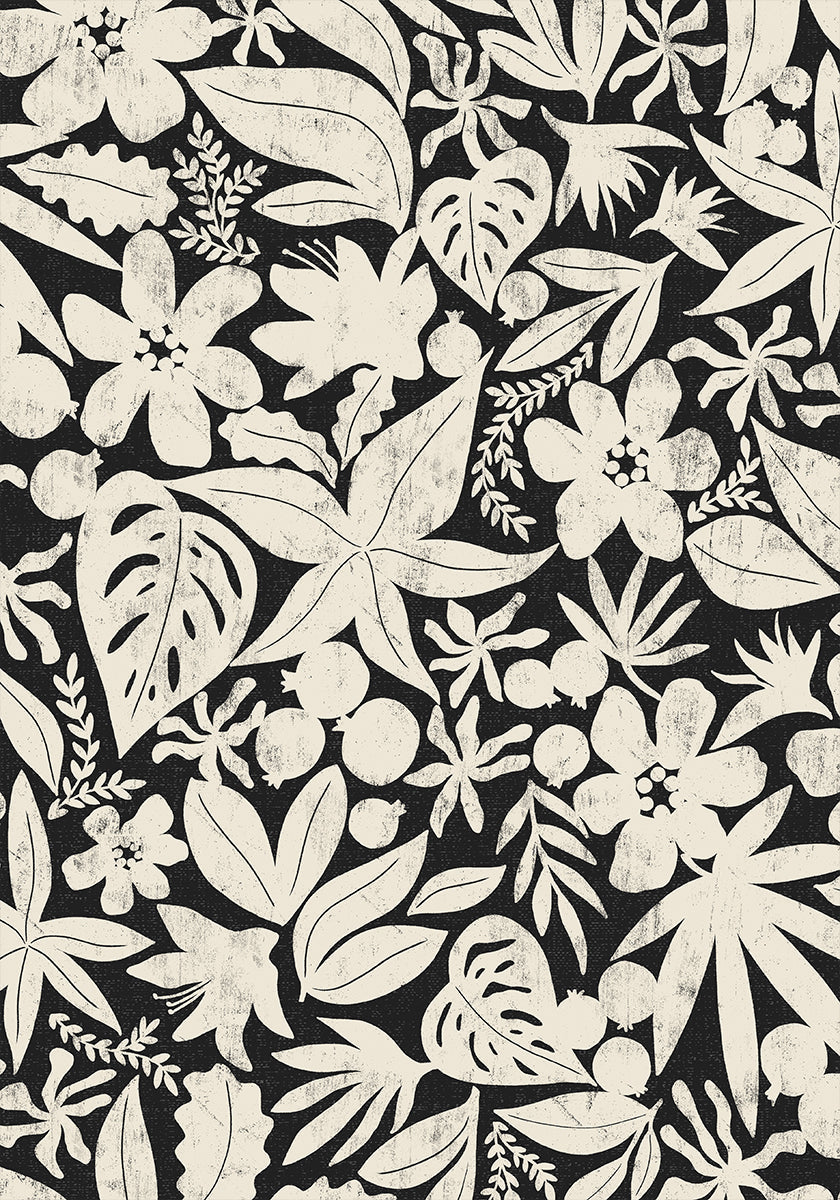 Cozy av Dana Ďuričeková er en grafisk sort-hvitt-plakat med håndtegnede silhuetter av tropiske blader, blomster og frukt. Sterke kontraster og subtil tekstur skaper et moderne, men lunt uttrykk. Organiske former og rytme gir rommet en sommerlig ro og et dristig, botanisk preg. Perfekt som blikkfang i et moderne, nordisk interiør.