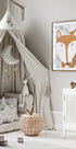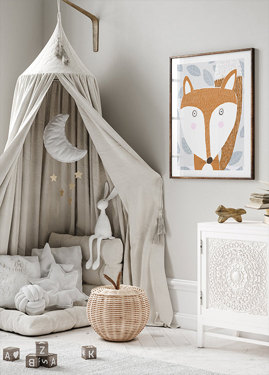 En sjarmerende rødrev titter frem blant grå bladformer i et nordisk, vinterlig uttrykk. De myke, grafiske linjene og det varme rødtonede pelsmotivet skaper en leken kontrast til de kjølige, snødekte nyansene. Illustrasjonen er signert kunstneren Carla Daly og passer perfekt til barnerom og moderne hjem.