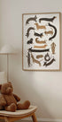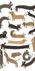 En sjarmerende og lekende illustrasjon av dachshunder i ulike stillinger – strekkende, løpende og avslappende. De varme jordfargene og den håndtegnede stilen gjør dette kunstverket perfekt for hundeelskere, barnerom eller for alle som liker morsom og vennlig veggkunst.