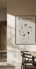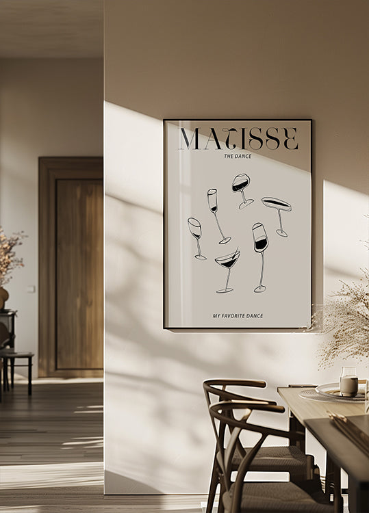 En leken, minimalistisk svart-hvitt-illustrasjon av vinglass som ser ut til å danse i rytmiske buer. De rene linjene og balanserte formene gir et moderne, grafisk uttrykk med et hint av Matisse-inspirert eleganse. Et stilrent motiv som fanger bevegelse, feststemning og hverdagslig poesi. Myke kurver og negativt rom antyder skål og rytme.