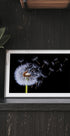 Et delikat nærbilde av en løvetann som slipper frøene sine ut i luften mot en mørk bakgrunn. De svevende fnuggene symboliserer frihet, skjørhet og flyktig skjønnhet, og gjør dette kunstverket til et poetisk valg for ethvert rom.