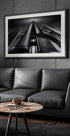 En dramatisk svart-hvitt byscene fra Madrids Cuatro Torres Business Area, hvor de slanke skyskraperne reiser seg som noe fra Darth Vaders univers. Jorge Ruiz Dueso fanger linjer, lys og skygge i en kraftfull komposisjon med tydelig dybde og fluktpunkt – perfekt for moderne interiører. Et blikkfang som gir rommet en markant, futuristisk puls.