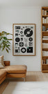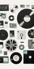 En nostalgisk komposisjon av vintage medier og lagringsformater som vinylplater, kassetter, disketter, CD-er og filmruller. Dette kunstverket hyller teknologiens og musikkens utvikling, og tilfører retro sjarm til moderne interiør.