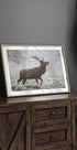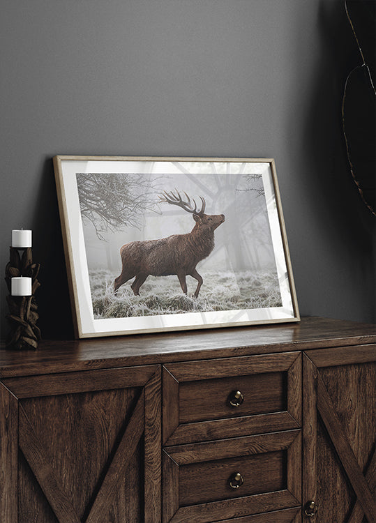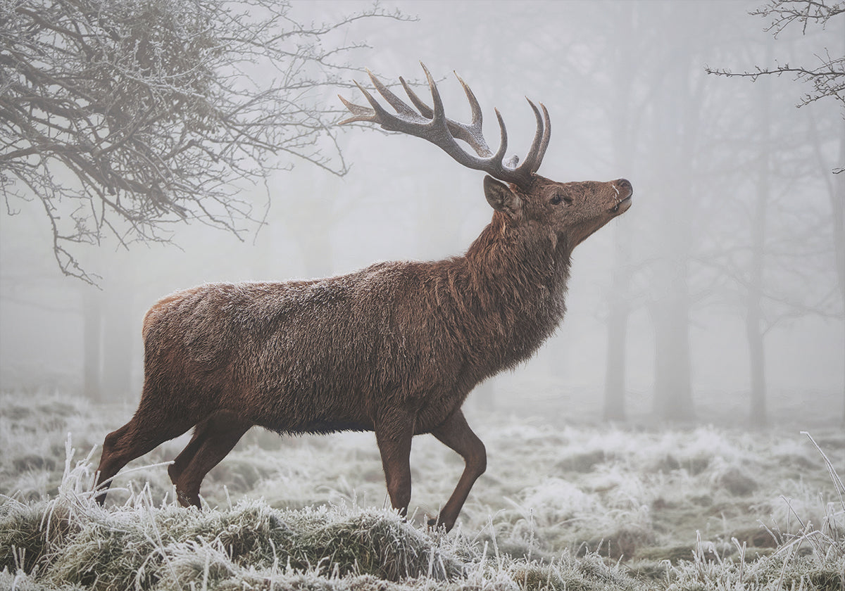 Et stolt rådyr trer fram i vinterlys, dampen fra pusten svinner mens rim kler de mektige geviret. Det dempede, blågrå morgenlyset gir motivet en stille, nordisk ro og en følelse av villmark tett på. Skapt av Cristian Vasile blir øyeblikket en poetisk hyllest til naturens verdighet. Et blikkfang i stua.