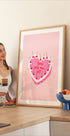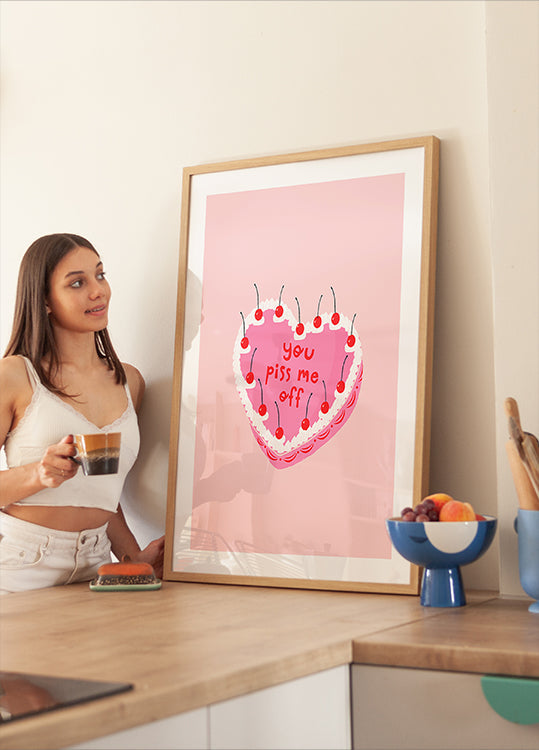 En leken og romantisk plakat av Aislinn Simmonds: en rosa illustrasjon med bursdagskake, glødende stearinlys og et varmhjertet sitat rundt et hjerte. Perfekt til bursdag, Valentine eller for å spre kjærlighet hjemme – myke pasteller, søt symbolikk og lun stemning i ett. Passer like godt på barnerommet som i stuen.