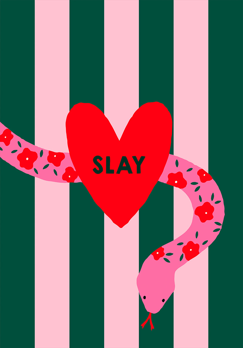 Et grafisk motiv i varme toner av rød og rosa, med et stort hjerte og leken typografi som uttrykker et romantisk budskap – perfekt til Valentinsdagen eller for å feire kjærligheten året rundt. Design av Aislinn Simmonds, som forener enkel form med dristige farger for et moderne uttrykk. Et blikkfang på veggen.