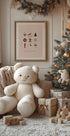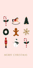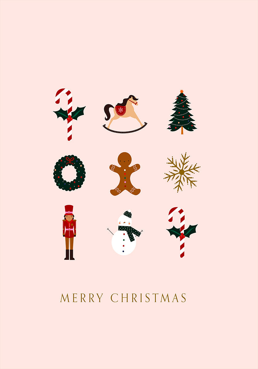 Et stilrent og moderne julemotiv med klassiske ikoner som julegrisen, pepperkakemannen, snømannen, julekula, nøtteknekker, juletrær og sukkertøy-stokker. Illustrasjonene er arrangert ryddig mot en myk rosa bakgrunn, noe som gir et varmt, lekent og elegant uttrykk. Nederst står den gyldne teksten “Merry Christmas”, som fullfører det festlige og tidløse designet.