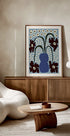 Et levende, grafisk stilleben: en frodig, hengende oransje bregne som faller mykt fra en elegant vase mot en dyp blå bakgrunn. De klare formene og den moderne paletten gir rommet energi og ro på samme tid. Perfekt blikkfang i stue, gang eller arbeidsplass. Den gir en frisk, botanisk puls til interiøret. Kunstverk av Miho Art Studio.