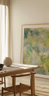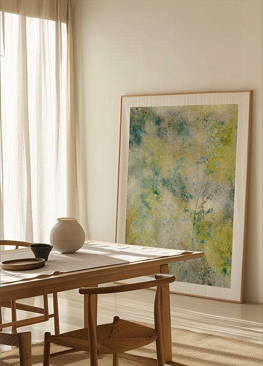 Et delikat impresjonistisk kunstverk som blander botaniske former med myke maleriske teksturer. Sarte nyanser av grønt, blått og gyllengult skaper en drømmende og rolig stemning som fanger naturens flyktige skjønnhet. Perfekt for å tilføre en beroligende og kunstnerisk følelse til ethvert rom.