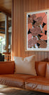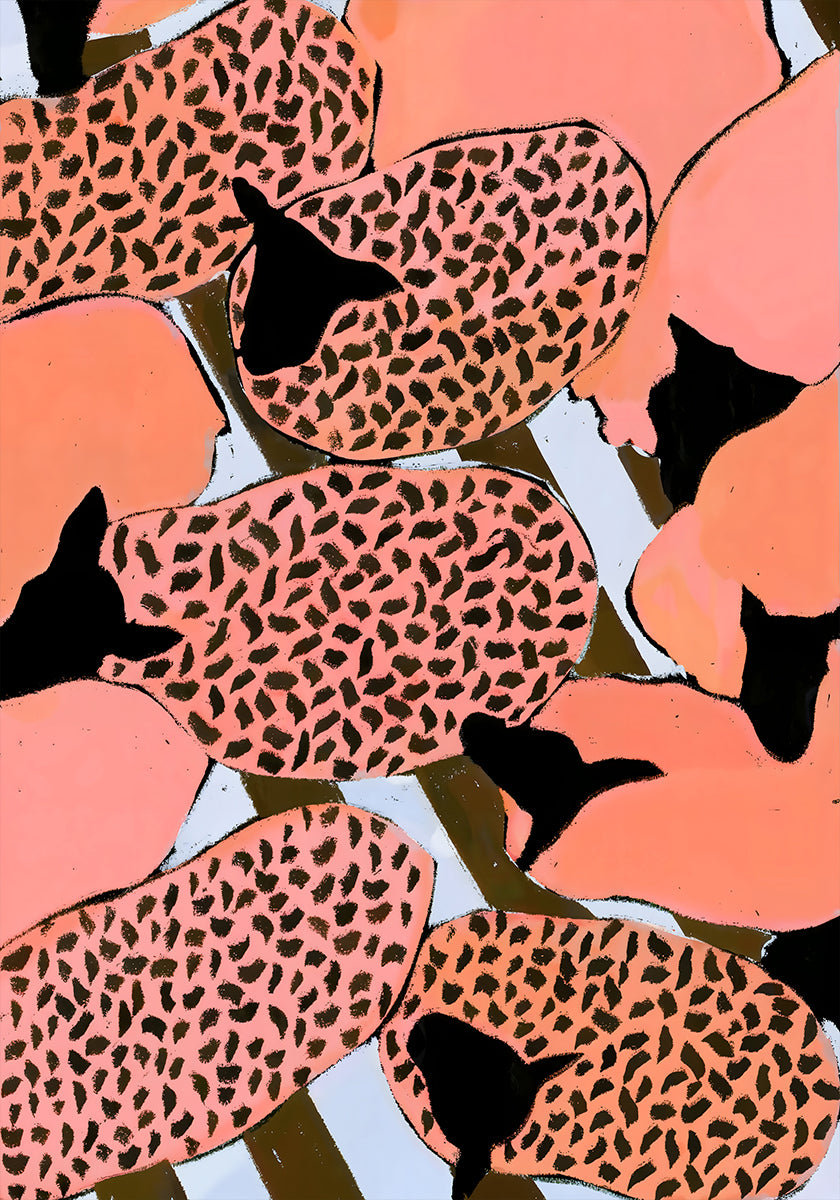 Flock Study av Uma Gokhale er en leken og moderne plakat der en flokk sauer i neonrosa toner vandrer samlet over en grafisk zebraovergang. Kontraster i svart, hvitt og rosa skaper rytme og bevegelse, mens det stiliserte uttrykket gir et urbant, humoristisk blikk på dyreliv i byen. Perfekt som et dristig blikkfang i hjemmet.