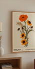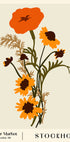 En minimalistisk Stockholm blomsterplakat med sterke oransje og gule blomster i rene grafiske linjer. Dette skandinavisk-inspirerte kunstverket fanger enkelhet og naturlig skjønnhet, perfekt for moderne interiør.