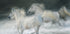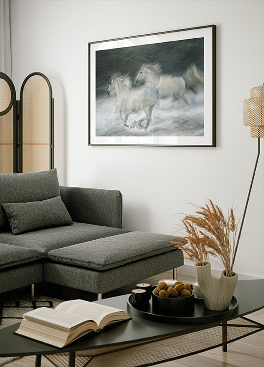 To hester kaster seg fram gjennom snøsprut som i en intens duell; dampen står fra pustene, manen flyr og musklene tegner seg grafisk mot et lysende vinterlandskap. High-key-estetikken gir en luftig, nesten abstrakt kraft. Fotografiet er signert Milan Malovrh, mester i dynamisk hestefotografi. Perfekt for minimalistiske rom.
