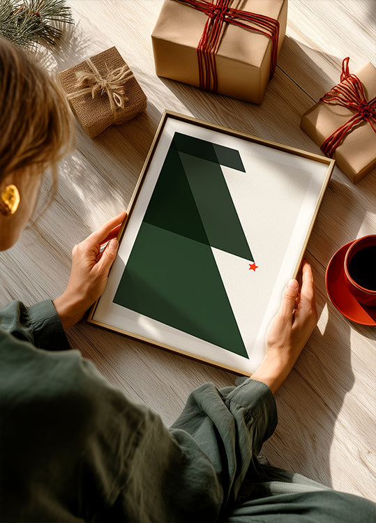 Opplev julens stillhet i Kubistikas «Holy Night, Silent Night 2». En minimalistisk, geometrisk gran i dype grønntoner løfter seg mot en stjerneklar himmel, der rene linjer og generøs negativ plass gir et rolig, moderne uttrykk som kler både skandinavisk interiør og koselige vinterkvelder. Perfekt som sesongens blikkfang på veggen.