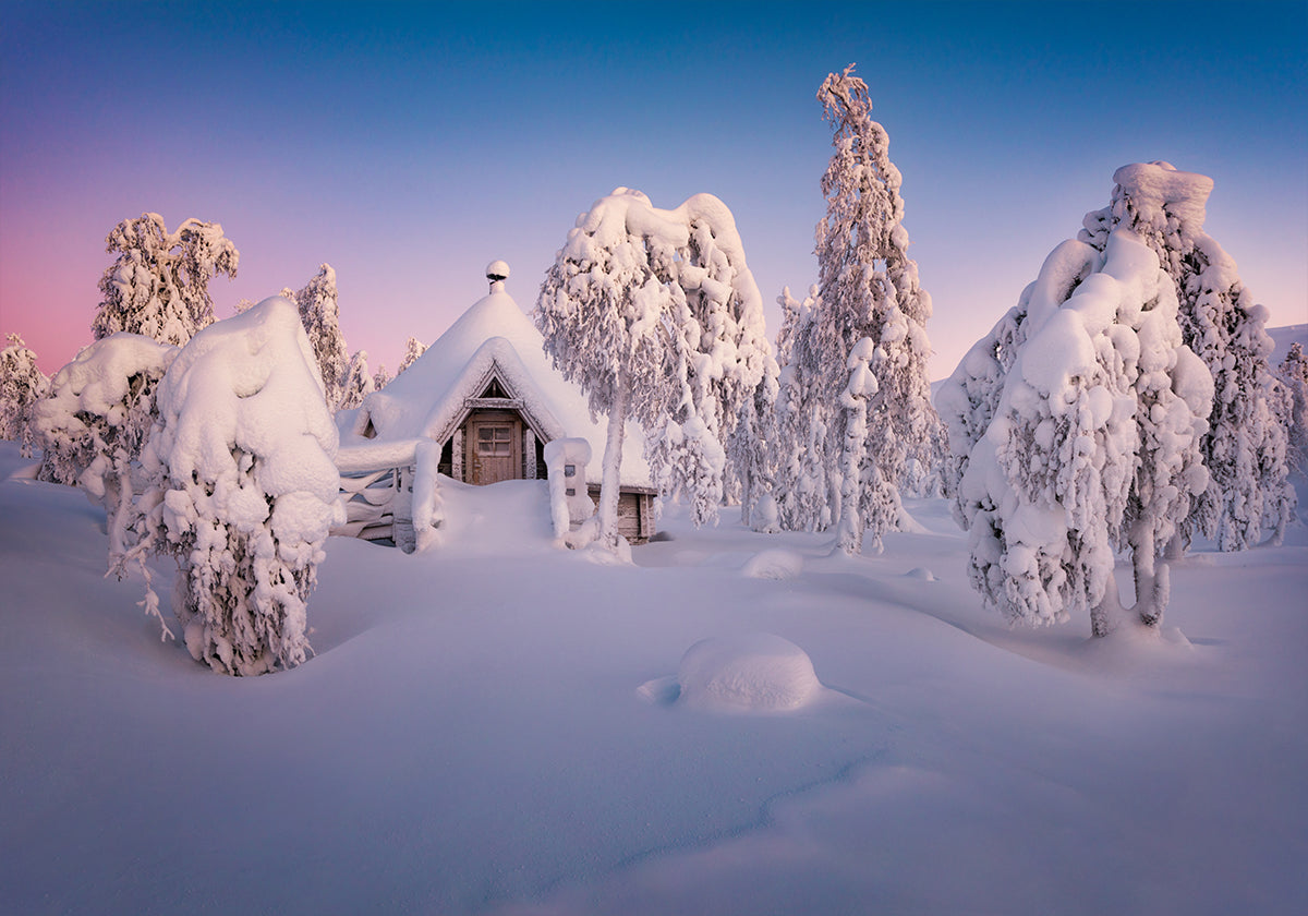 Et tidløst vintermotiv av en enslig hytte i det finske landskapet, innrammet av snødekte trær og stille marker. Varmt lys i vinduene bryter kulden og gir en følelse av ro og tilhørighet. Fanget med poetisk blikk av fotograf Raymond Hoffmann – et hjemlig pusterom på veggen. En hyllest til nordisk ro, tradisjoner og vinterens stille magi.