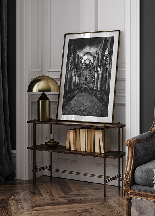 Et stemningsfullt blikk inn i Lisboas takløse Igreja do Carmo: gotiske buer stiger mot himmelen i perfekt symmetri, der lys og skygge fremhever de tidstyngete ribbene. Mike Kreiten fanger ruinens stille storhet – en poetisk påminnelse om tid, tro og arkitekturens utholdenhet. Et ikonisk motiv som gir tyngde til minimalistiske rom.