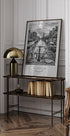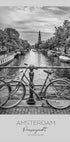 En stilsikker plakat av Melanie Viola som fanger Prinsengracht i Amsterdam i monokrom eleganse. Sykler langs rekkverket leder blikket mot kanalen og husbåtene, med Westerkerk og Westertoren som ikonisk silhuett. En tidløs hyllest til byens rytme og typiske gatebilde. Grafisk fokus på ordet AMSTERDAM gir et moderne preg.