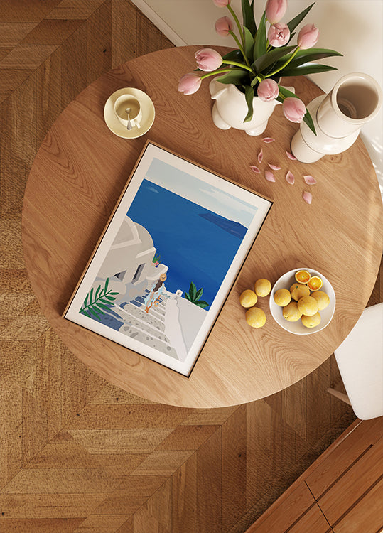 Into the Blue av Petra Lizde fanger følelsen av sommer på Santorini: hvitkalkede bygg som trinn ned mot det dypblå havet, klare skygger og en kvinne med parasoll som nyter brisen. En grafisk, minimalistisk komposisjon i blått og hvitt som bringer reiselyst, ro og solfylt eleganse til veggen. Perfekt som blikkfang i stue, gang eller sommerhus.