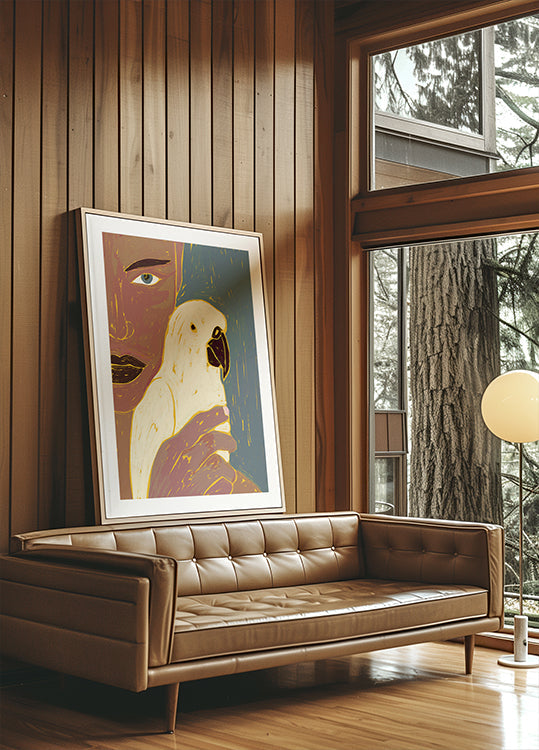 Keeper of Secrets av Uma Gokhale fanger et intimt øyeblikk mellom en kvinne og en fargerik fugl. Nærbildet av blikk og fjær skaper en hemmelighetsfull dialog, der varme toner og dristige kontraster gir tropisk energi. En moderne portrettplakat som inviterer til nysgjerrighet og samtaler. Perfekt som blikkfang i stue, soverom eller kontor.