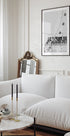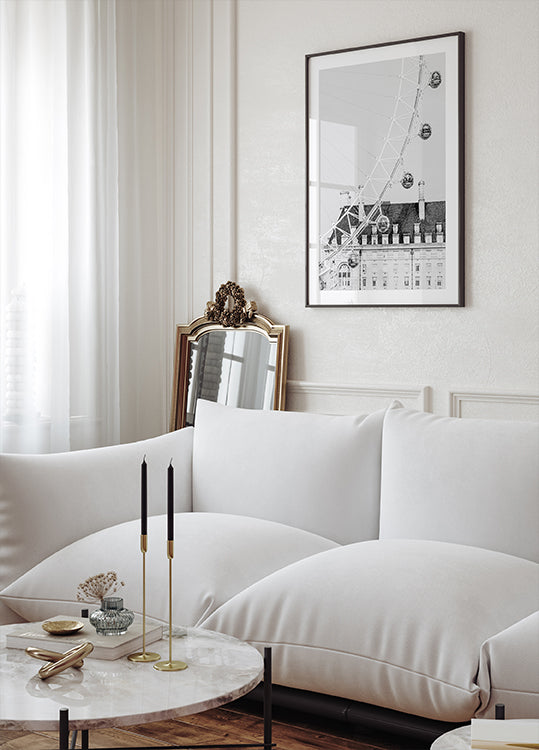 Et slående svart-hvitt fotografi som viser en nærbilde av London Eye mot en bakgrunn av klassisk arkitektur. Det intrikate designet på pariserhjulet står i kontrast til den historiske bygningen, og fremhever samspillet mellom moderne ingeniørkunst og tidløs eleganse. Den monokrome paletten forsterker de geometriske mønstrene og strukturelle detaljene, og gir en sofistikert og kunstnerisk fremstilling av det ikoniske landemerket.
