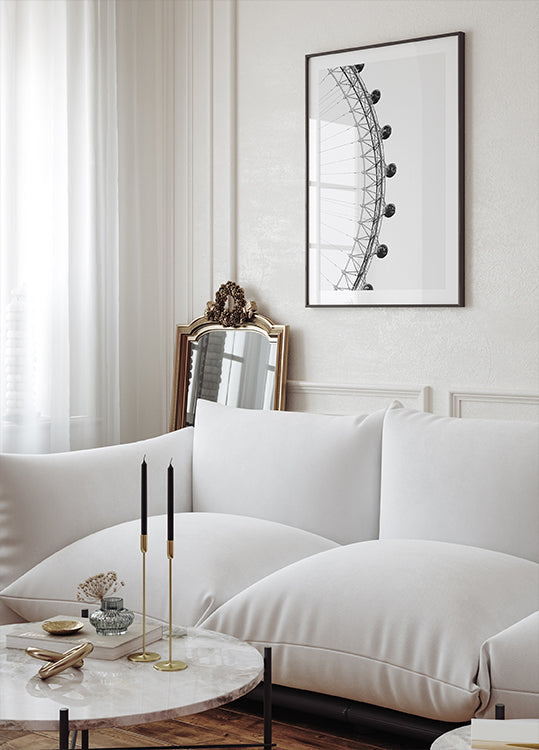 Et fantastisk svart-hvitt fotografi som fanger den intrikate strukturen til London Eye fra et minimalistisk perspektiv. De geometriske linjene og symmetrien i pariserhjulet står i kontrast til den rene, hvite bakgrunnen og fremhever den moderne elegansen og ingeniørpresisjonen til dette ikoniske landemerket. Den monokrome paletten forsterker det visuelle uttrykket og gir en sofistikert og tidløs estetikk.