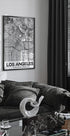 En skarp monokrom hyllest til City of Angels: «Los Angeles» satt i fet svart typografi på ren hvit bakgrunn, med subtile linjer og geometriske hint som speiler gater, kvartaler og skyline-rytme. Minimalistisk, retro og urban—et tidløst nikk til reiselyst, nostalgi og bystolthet. Grafiske linjer antyder kart og bygrid.