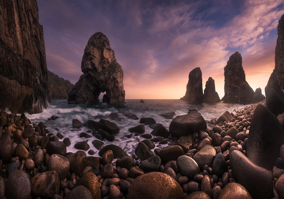 Ved Louriçal-kysten utenfor Sintra reiser en dramatisk steinbue seg av Atlanterhavet mens kveldssola farger himmelen i varme toner. Skarpe klipper, bølger som slår mot rullestein og et glimt av eventyr skaper en rolig, men kraftfull stemning. Fotografert av Carlos F. Turienzo. Perfekt for deg som elsker rå kystlandskap og gyldne solnedganger.