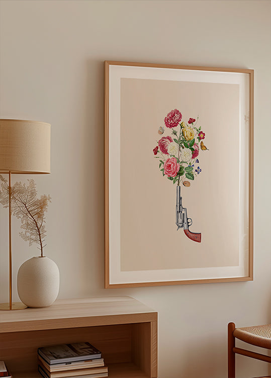 Love, Not War av CATS AND DOTZ forvandler en pistol til en blomstrende bukett – et modig, poetisk bilde der kraft erstattes av omsorg. De sterke kontrastene og den lekne symbolikken løfter rommet og sender et klart budskap: la håpet spire, la kjærligheten skyte knopper i stedet for kuler. Et sterkt statement for fred og håp.