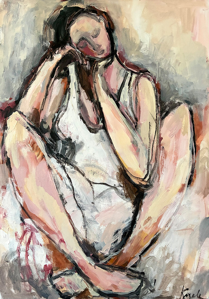 Morning av Magdalena Krzak fanger det første lyset av dagen: en drømmende, figurativ silhuett av en kvinne som strekker seg i myke rosatoner og hvite flater. Subtile, abstrakte streker gir bevegelse og ro på samme tid, og inviterer til en stille pause, håp og en ny start i rommet. Perfekt som et mykt blikkfang i stue, soverom eller kreative hjørner.