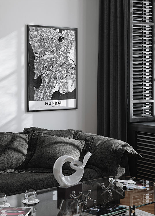 En elegant, minimalistisk bykart-plakat av Mumbai som følger den ikoniske kystlinjen mot Arabiahavet og de slyngede våtmarkene. Tette gatenett og tydelige bydelskonturer fra Colaba til Bandra fanger metropolens puls og gjør plakaten til et tidløst, moderne statement i urbane interiører. Perfekt som fokuspunkt på veggen.