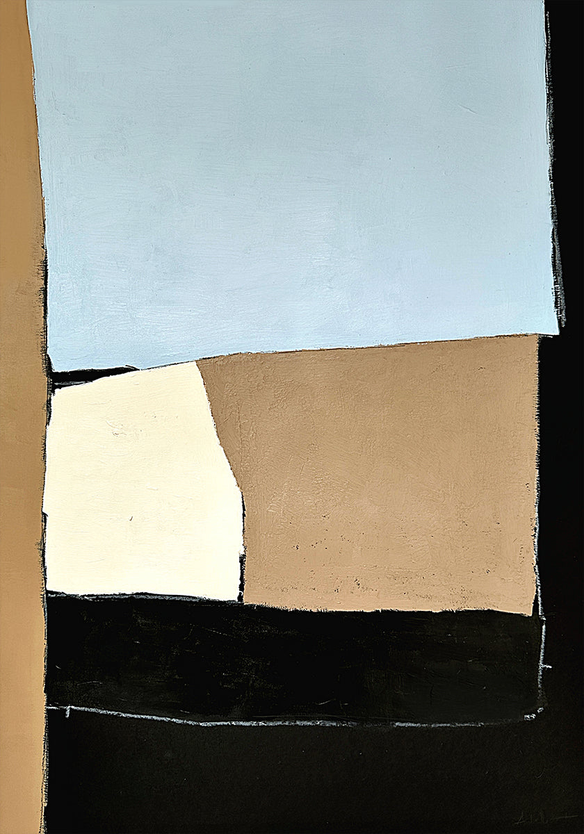 Noir series no.4 av Andrea Reichhart forener stramme linjer og geometriske flater i en rolig palett av svart, beige, brun og dype blå toner. Komposisjonen leker med balanse og kontrast, og gir et moderne, sofistikert uttrykk som fungerer like godt som solist som i en kuratert bildevegg. Perfekt for moderne, minimalistiske interiører.