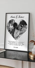 En stilren jubileumsplakat i svart-hvitt med personlig typografi: legg inn navn, dato og koordinater for deres spesielle sted. Minimalistisk scandi-uttrykk med balanserte linjer og tydelig hierarki gjør den til et elegant blikkfang i stue, soverom eller gang—og en perfekt, varig gave til dere selv eller et par.