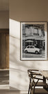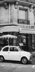Dette svart-hvitt-fotografiet fanger den tidløse sjarmen ved et gatehjørne i Paris, der en klassisk hvit Fiat 500 er parkert foran Café Fleurus. Den vintage stemningen, utsmykkede balkonger og stripete markiser inviterer betrakteren inn i en nostalgisk fransk scene. Perfekt for elskere av parisisk arkitektur, europeiske bylandskap og monokrom fotografering — en sofistikert tillegg til gallerivegger eller urbane interiører.