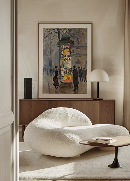 Dikhotomy fanger møtepunktet mellom punk og klassisk kunst: Et snødekt parisisk gateliv oversvømmes av konsertplakater for Sex Pistols, Ramones, The Clash og Blondie, malt i dristige, maleriske strøk som nikker til Van Gogh, Monet, Manet og Toulouse-Lautrec – en energisk, surrealistisk kollasj. Perfekt for musikkelskere og kunstneriske hjem.