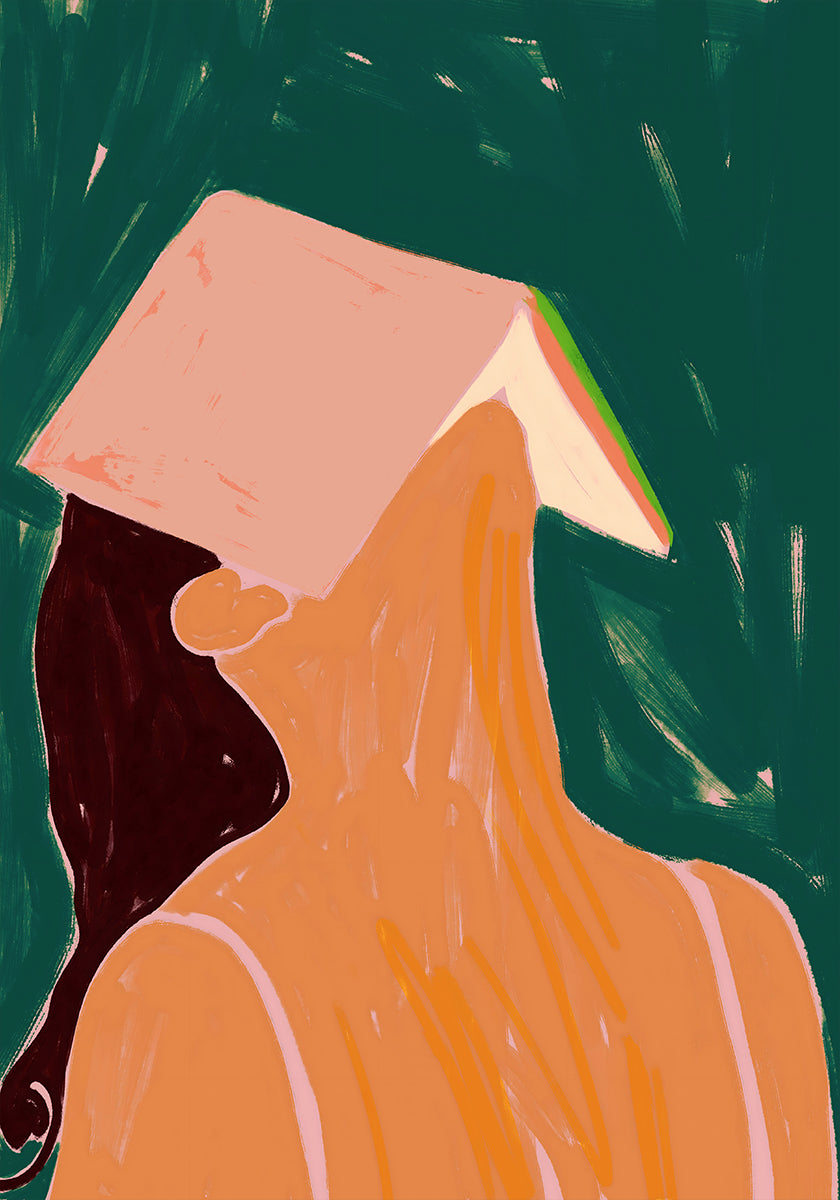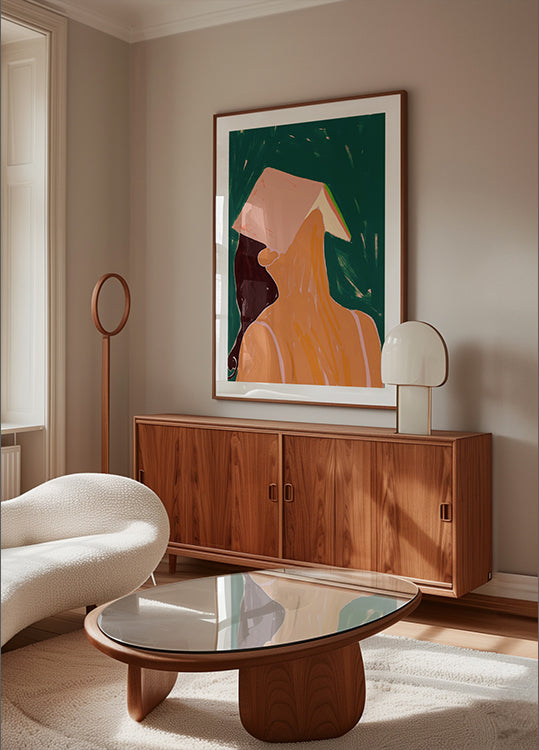 Et stemningsfullt portrett av en kvinne fordypet i en bok, fanget i et stille øyeblikk av ettertanke. Myke pasteller og rolige toner skaper en varm, poetisk atmosfære som inviterer til ro og nærvær. Et moderne, minimalistisk uttrykk av Uma Gokhale – perfekt til lesekroken, stue eller soverom. Gir rom for stillhet.