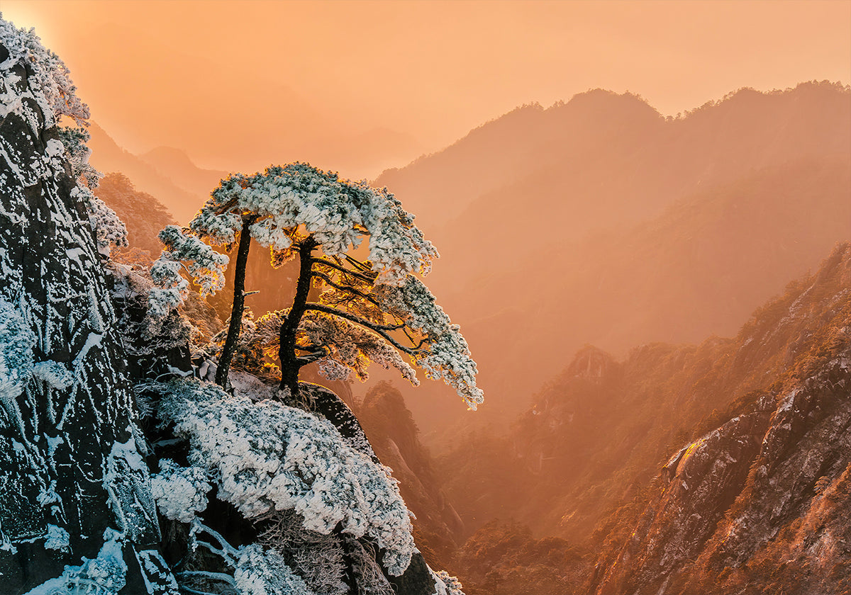 En iskald daggry-scene utspiller seg i fjellheimen: snøkledde topper reiser seg over en mørk furuskog, mens den første solranden kaster varm glød over is og skygger. Resilience on the Edge av Wei (David) Dai fanger stillheten før dagen, der naturens rå styrke møter skjør balanse langs en bratt egg i det fjerne.