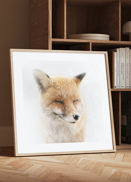 Meet winter’s quiet joy: a fluffy red fox, eyes gently closed as snow drifts fall, wearing a serene, satisfied smile. Frost kisses its whiskers and fur, while the soft white backdrop amplifies the calm. A charming wildlife portrait by artist Doris Reindl that radiates warmth, humor, and seasonal magic.