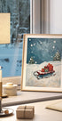 En stemningsfull vinterplakat av Ohkimiko: En slede lastet med gaver hviler i nyfalne snøfnugg ved et glitrende juletre, omgitt av stille graner. Dempede nordiske toner og varm lyssetting fanger adventsfølelse, forventning og ro – perfekt til stue, gang eller barnerom i den koselige juleperioden. Hjemmekos.