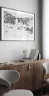 Snødekte fjelltopper stiger dramatisk over en stille dal i denne stemningsfulle, svart-hvite komposisjonen fra Del Mundo Imagery. Tåkedotter slynger seg mellom taggete rygger, skogbryn og fjerne vidder, og gir en følelse av ro, villmark og tidløs minimalisme — perfekt til hytte, stue eller moderne kontor.