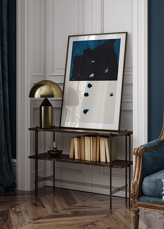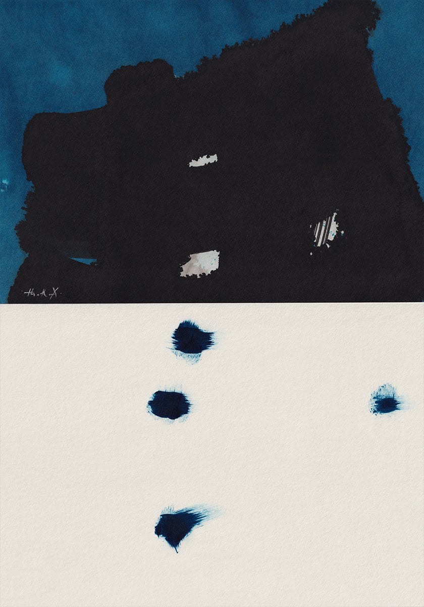 Step By Step av Thoth Adan er en rolig, japandi-inspirert komposisjon: en enslig skikkelse følger en smal sti gjennom snødekte, mørkeblå fjell under en stille natt. Med minimalistiske, blekkaktige strøk og balanserte flater formidler motivet stillhet, ettertanke og varsom bevegelse fremover. Inspirert av zen og naturens rytme.
