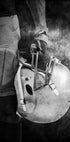 Plakaten viser en svart-hvitt fotografi av en amerikansk fotballspiller som holder en hjelm. Deler av spilleren er synlige, inkludert en arm og del av drakten, men ansiktet er ikke synlig. Komposisjonen fremhever detaljene i hjelmen og teksturen i klærne, med en dramatisk, uskarp bakgrunn som skaper en kraftfull atmosfære.