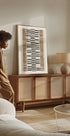Striped Harmony av THE MIUUS STUDIO forener stramme vertikale striper med stablede halvsirkler i en behersket palett av beige, svart og grå. Subtile akvarellteksturer myker opp geometrien og skaper en rolig, balansert rytme som gir rommet en moderne, skandinavisk eleganse og visuell dybde. Perfekt som rolig fokuspunkt i stue, soverom eller kontor.