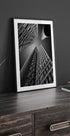 Summer in the city III av willem fanger storbyens puls i monokrom eleganse: himmelen skjæres av dramatiske linjer fra tårn og fasader, sett i kraftig froskeperspektiv. Kontrasten mellom lys og skygge fremhever grafiske mønstre, og leder blikket innover i Amsterdams urbane geometri og tidløse rytme.