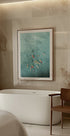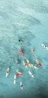 En forfriskende plakat tatt fra luften som viser surfere som flyter på turkist vann og venter på neste bølge. Denne kystplakaten gir en følelse av frihet, sol og sommerstemning — perfekt for strandelskere og moderne interiør.