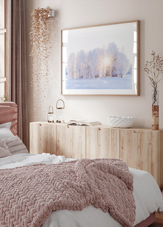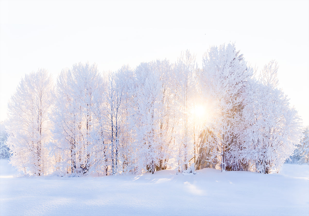 Lyset vender tilbake i en stille vinterlund: solstråler bryter forsiktig gjennom blåfrostede trær og maler snøen i myke gule toner. «The light returns» av EMELIEmaria fanger øyeblikket der kulden slipper taket og naturen puster på nytt – en rolig, poetisk stemning for vegger som trenger lys. Perfekt som rolig fokus i stue eller arbeidsrom.